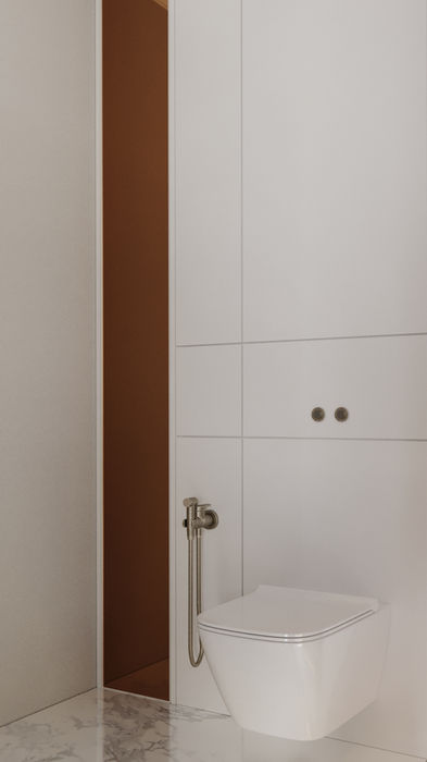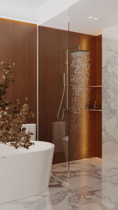 Styl tej łazienki, łączy nowoczesność z klasyką, będzie aktualny przez wiele lat. Ciepłe kolory drewna, marmurowe płytki, wysokie gzymsy i eleganckie baterie nadają wnętrzu niepowtarzalnej elegancji.