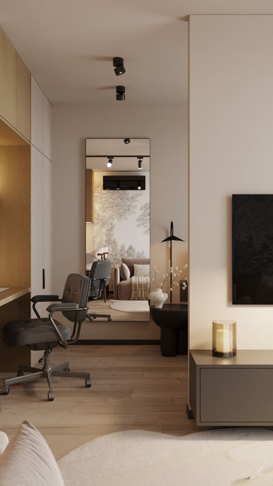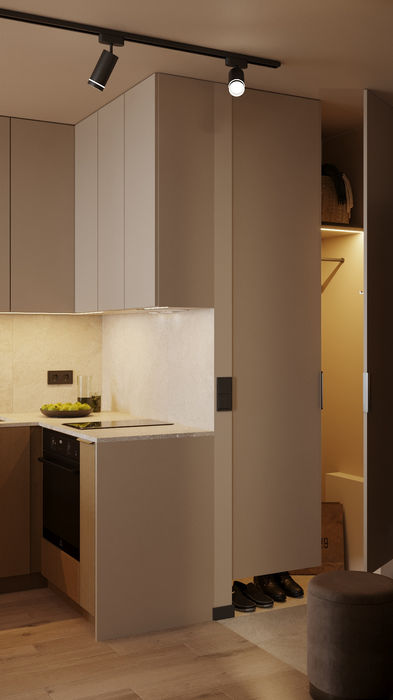 Ta kawalerka została zaprojektowana z myślą o młodej dziewczynie i jej codzienności — pracy, odpoczynku, przechowywaniu, spotkaniach i chwilach tylko dla siebie.